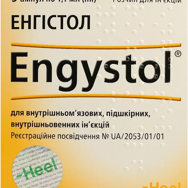 - Енгістол розчин для ін’єкцій в ампулах по 1.1 мл – безбарвний прозорий розчин без запаху. 1,1 мл розчину містять: Sulfur D4 – 3,3 мкл, Sulfur D10 – 3,3 мкл, Vincetoxicum hirundinaria D6 – 6,6 мкл, Vincetoxicum hirundinaria D10 – 6,6 мкл, Vincetoxicum hirundinaria D30 – 6,6 мкл та допоміжні речовини, серед яких натрію хлорид і вода для ін’єкцій.