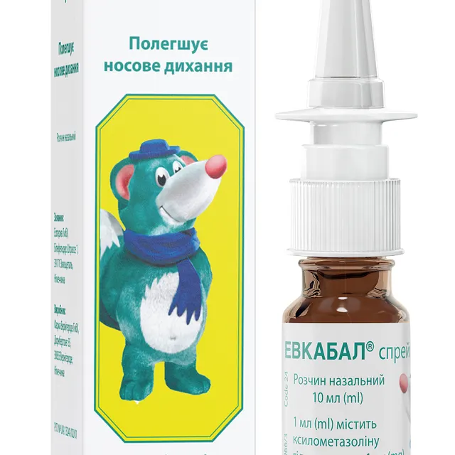 - Евкабал назальні краплі та спрей – 1 мл розчину містить ксилометазоліну гідрохлориду 1 мг;