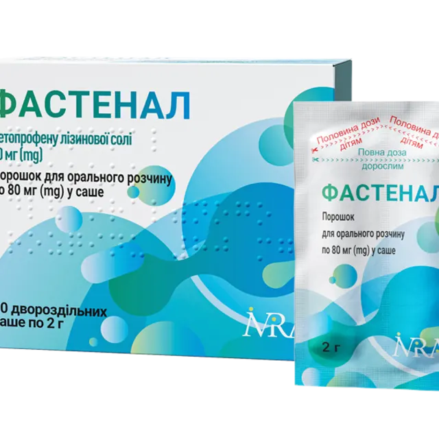 Препарат Фастенал доступний у лікарській формі порошку для орального розчину. Випускається в саше по 2 г. В 1 саше міститься 80 мг кетопрофену лізинової солі, що еквівалентно 50 мг кетопрофену. На препарат Фастенал ціна встановлена за упаковку, що містить 30 саше.