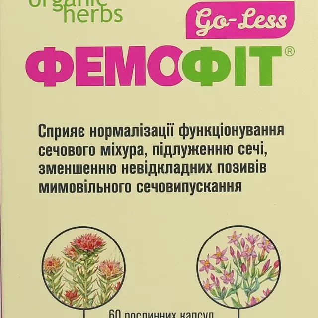 Засіб Фемофіт Go-Less у вигляді капсул показаний для нормалізації функціонування сечового міхура, підлуження сечі, зменшення невідкладних позивів мимовільного сечовипускання або епізодичного підтікання.