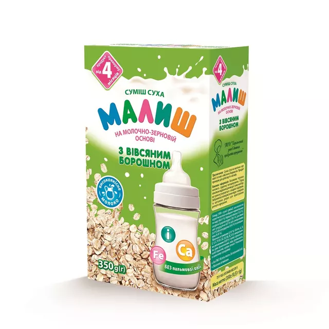 | Дитяче харчування на молочно-зерновій основі Малиш з вівсяним борошном з 4 місяців 350 г | 59.8 ₴ |