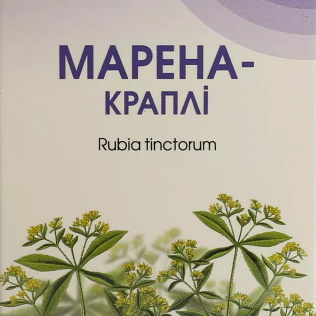 - Крапель для перорального прийому. Препарат у формі крапель складається з водно-спиртового екстракту кореневища з коренями марени (60%) та очищеної води (100%).