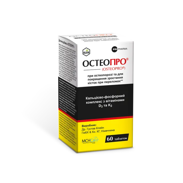 Остеопро – це дієтична добавка, що містить кальцієво-фосфорний комплекс та вітаміни D3 і K2. Вона сприяє підтриманню нормальних процесів у кістковій тканині. Основним компонентом препарату є мікрокристалічний гідроксіапатитний комплекс МСНАтм (МСН-Саlтм), у складі якого є мінеральна та органічна складові.
