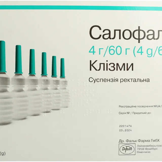 Салофальк суспензія ректальна 4 г клізма 60 мл №7 | 3498.76 ₴ |