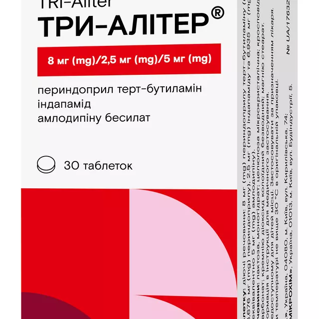 Три Алітер – комбінований препарат на основі трьох антигіпертензивних компонентів. Він належить до групи ліків, що впливають на ренін-ангіотензинову систему. Активні речовини засобу: інгібітор ангіотензинперетворювального ферменту периндоприлу терт-бутиламіну, сульфонамідний діуретик індапамід, а також інгібітор потоку іонів кальцію з групи дигідропіридинів амлодипін.