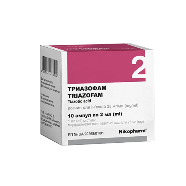Триазофам – лікарський засіб, що належить до фармакотерапевтичної групи кардіологічних препаратів. Його властивості зумовлені протиішемічною, мембраностабілізуючою, антиоксидантною, імуномодулювальною дією основного складника – тіазотної кислоти. Вона гальмує процеси окиснення ліпідів в ішемізованих ділянках міокарда, зменшує його чутливість до катехоламінів, запобігає прогресивному пригніченню скорочувальної функції серця, стабілізує та зменшує ділянку некрозу й ішемію міокарда.