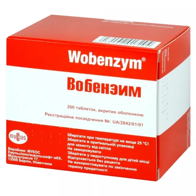 Вобензим – це комплексний лікарський засіб, який відноситься до протизапальних та імуномодулюючих препаратів. Він являє собою комбінацію натуральних ензимів тваринного та рослинного походження. Придбати таблетки Вобензим у Києві та в інших містах України за прийнятними цінами можна в аптеках мережі «Бажаємо здоров'я». Актуальна вартість препарату Вобензим вказана на офіційному сайті мережі.