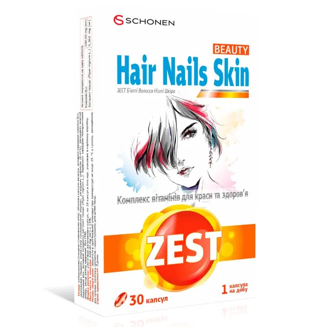 Добавка Зест Б'юті – це спеціальний комплекс вітамінів для краси та здоров’я шкіри, волосся та нігтів, що сприяє їх зміцненню та стимулює їх відновлення.