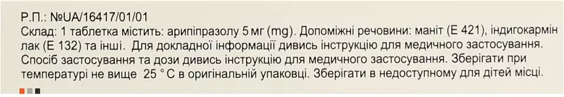 1 таблетка містить арипіпразолу 5 мг або 10 мг, або 15 мг, або 30 мг;