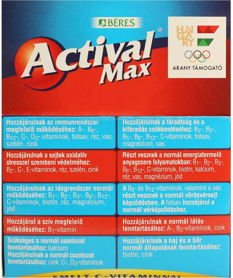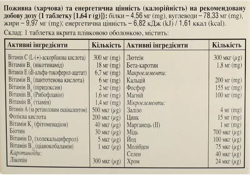 Склад:гідроген фосфат кальцію, аскорбінова кислота, оксид магнію, наповнювачі(мікрокристалічна целюлоза,манітол, полівінілпіролідон,гідроксипропілметилцелюлоза, полівінілполіпіролідон, полідекстроза), сульфат цинку, глюконат заліза, нікотинамід, антиспікаючий агент (кальцію карбонат, магнієві солі жирних кислот, тальк, кальцію силікат, кремнію діоксид), dl-альфа токоферол ацетат, крохмаль модифікований харчовий, барвник (титану діоксид, вугілля рослинне), пантотенат кальцію, крохмаль кукурудзяний, глюконат міді, желатин (містить рибний желатин), сироп глюкози, сульфат марганцю, піридоксину гідрохлорид, рибофлавін, бета-каротин, мононітрат тіаміну, вологоутримуючий агент (гліцерин), сахароза, стабілізатор (гуміарабікум), мальтодекстрин, ретинолу ацетат, антиоксиданти (натрію аскорбат, dl-α-токоферол, бутилгідрокситолуол), лютеїн, лікопін, фолієва кислота, йодат калію, частково гідрогенізованасоєва олія, гептамолібдат амонію, хлорид хрому, селеніт натрію, фітоменадіон, біотин, регулятор кислотності (натрію цитрат, кислота лимонна), емульгатор (трикальцію фосфат), холекальциферол, ціанокобаламін. Рекомендації до споживання: може бути рекомендована в якості дієтичної добавки, як додаткове джерело вітамінів, каротиноїдів, макро- та мікроелементів і підвищеним вмістом вітаміну С. Має загальнозміцнюючі властивості.Перед застосуванням рекомендована консультація лікаря.