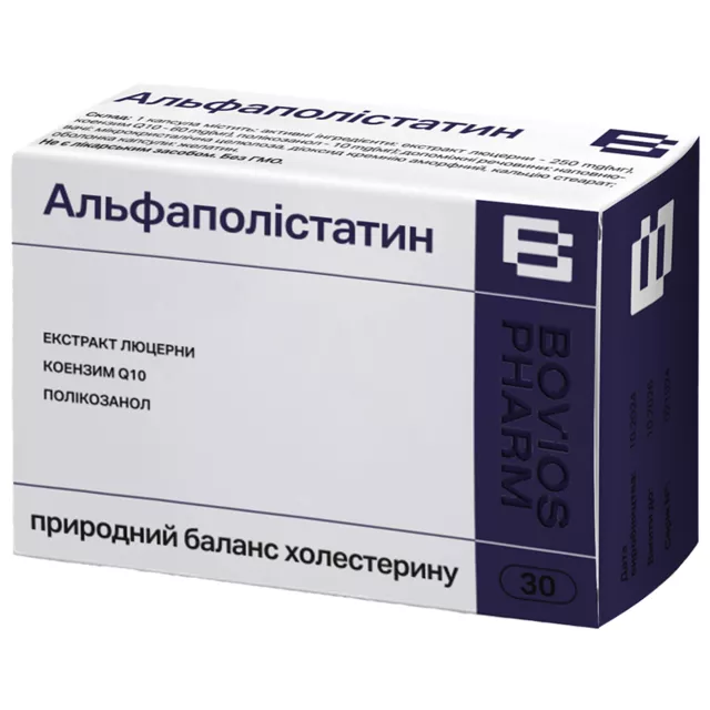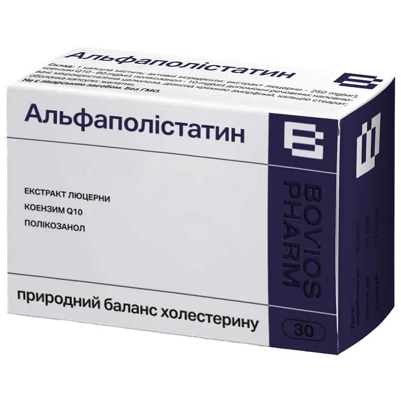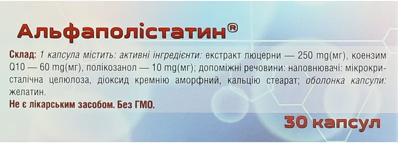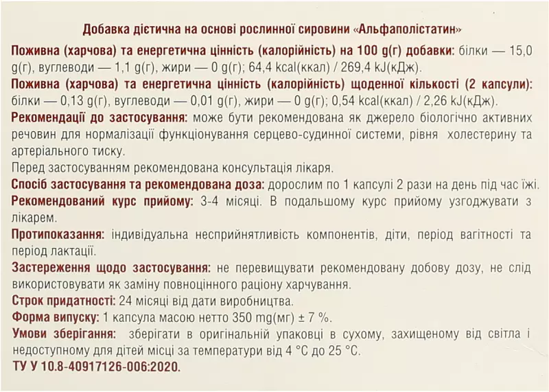 Добавка дієтична на основі рослинної сировини «Альфаполістатин» Склад: 1 капсула містить: активні інгредієнти: екстракт люцерни - 250 mg(мг), коензим Q10 - 60 mg(мг), полікозанол - 10 mg(мr) ; допоміжні речовини : наповнювачі: мікро кристалічна целюлоза, діоксид кремнію аморфний, кальцію стеарат ; оболонка капсули : желатин .Поживна (харчова) та енергетична цінність (калорійність) на 100 g(г) добавки: білки - 15,0 g(г) , вуглеводи - 1,1 g(г), жири - О g(r) ; 64,4 kсаІ(ккал) / 269,4 kJ(кДж) .