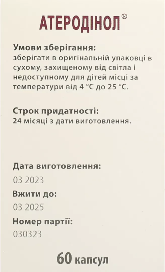 Зберігати препарат «Атеродінол» слід в оригінальній упаковці в сухому, захищеному від світла місці при температурі від 4°C до 25°C. Термін придатності – 24 місяці. Не використовувати препарат після закінчення терміну придатності, зазначеного на упаковці.