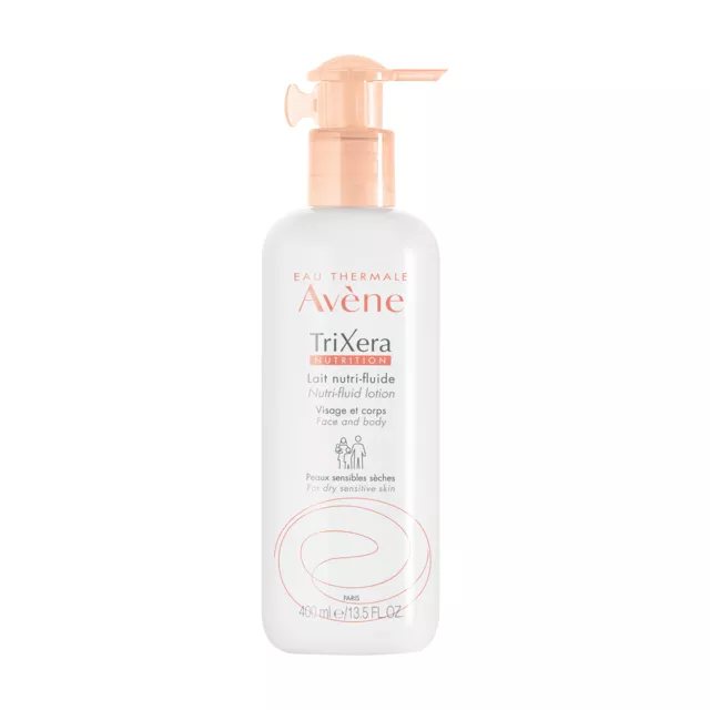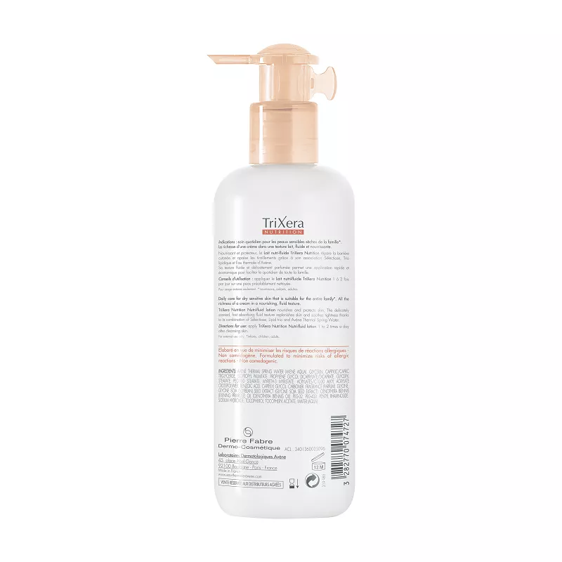 TriXeraNUTRITIONNutri-Fluid живить, захищає та відновлює захисний бар'єр сухої та дуже сухої шкіри всієї родини. Легка, нежирна, нелипка текстура полегшує використання та дозволяє швидко наносити. Засіб для щоденного догляду з ніжним ароматом, завдяки поєднанню трьох рослинних ліпідів - Selectiose (запатентований активний інгредієнт Pierre Fabre) і термальної води Avène із заспокійливими властивостями та властивостями проти подразнення, заспокоює та зволожує протягом 48 годин