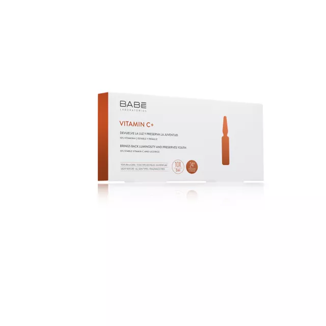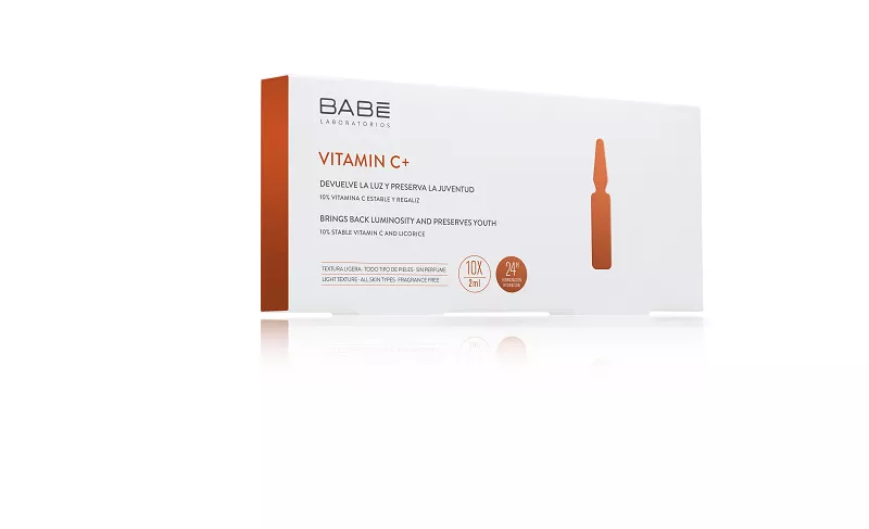 Ампули-концетрат VITAMIN C + BABE містять 10% стабільного вітаміну С, а також екстракт солодки, за рахунок чого вони роблять шкіру більш пружною, а також вирівнюють тон шкіри. Ампули забезпечують здорове сяйво шкіри, діючи як антиоксидант, а також ефективно борються з пігментацією. Рекомендується використовувати для тьмяної та втомленої шкіри, а також для запобігання фотостаріння і при активному перебування на сонці. Також в результаті використання ампул шкіра отримує необхідне зволоження протягом 24 годин.