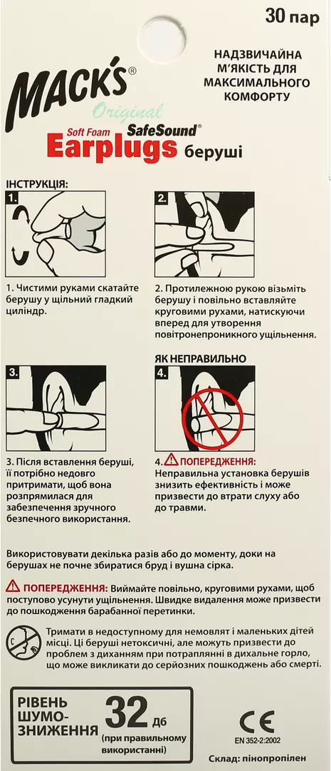 4. УВАГА: Неправильна установка берушей може призвести до зниження ефективності