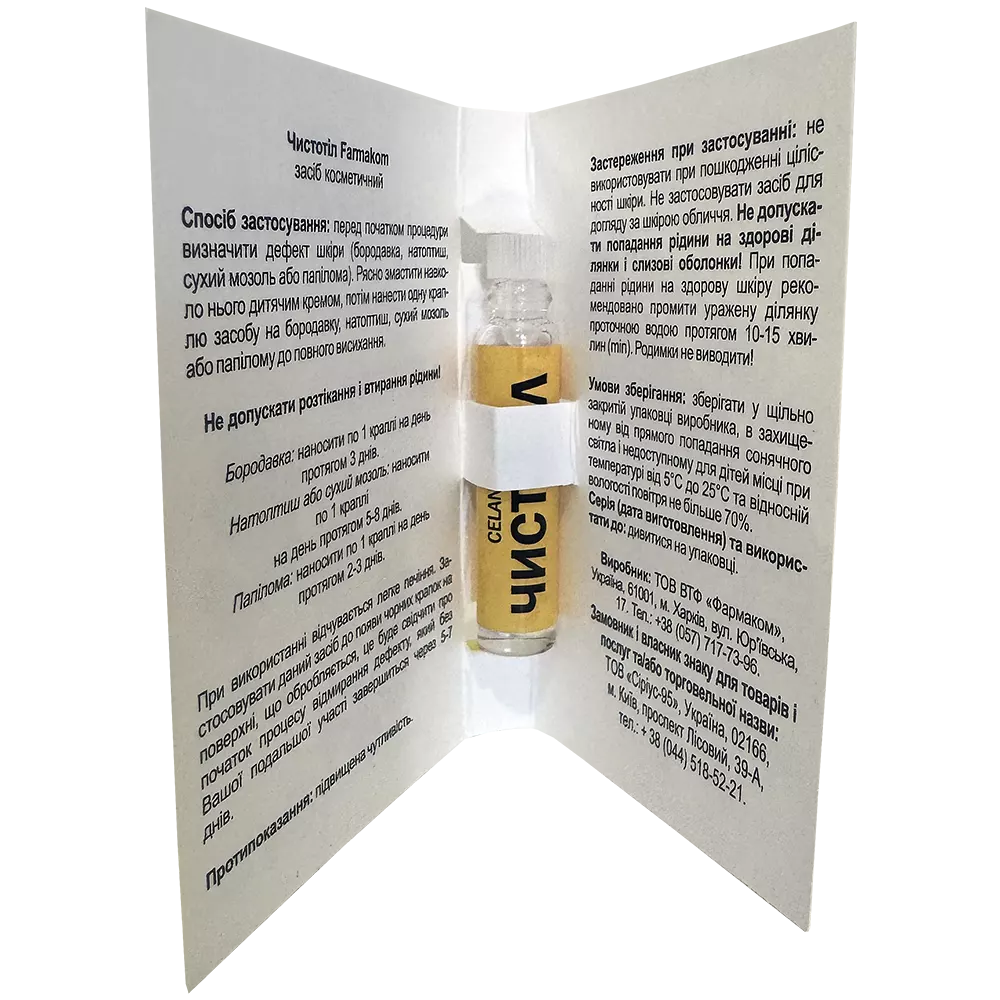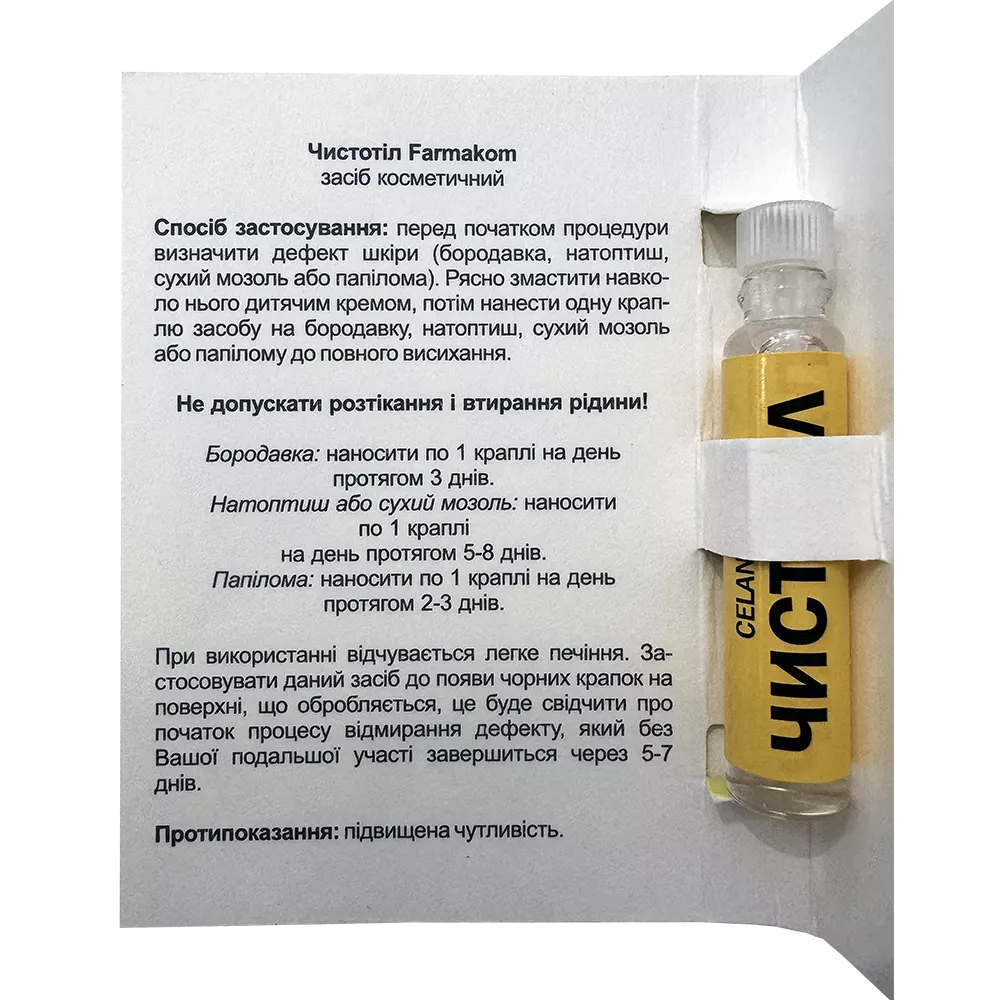 Спосіб застосування: перед початком процедури визначити дефект шкіри (бородавка, натоптиш, сухий мозоль або папілома). Рясно змастити навколо нього дитячим кремом, потім нанести одну краплю засобу «Чистотіл Farmakom» на бородавку, натоптиш, сухий мозоль або папілому до повного висихання. Не допускати розтікання і втирання рідини!