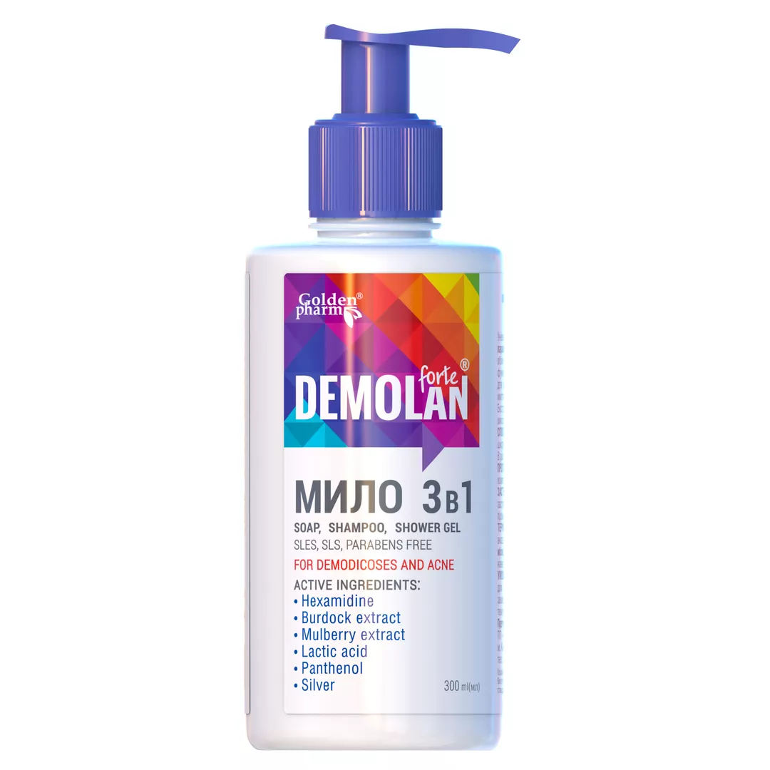 Мило Демолан Форте 3 в 1 (мило, шампунь, гель для душу) поєднує три функції: можливість використовувати як мило для вмивання, гель для душу та шампунь для миття волосся. Цей препарат розроблений з урахуванням фізіології шкіри, ураженої кліщем демодекс, а також шкіри схильної до акне. Високий рівень ефективності надає поєднання рослинних компонентів та активних субстанцій.