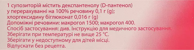 1 супозиторій містить декспантенолу (D-пантенолу) у перерахуванні на 100 % речовину 0,1 г; хлоргексидину біглюконату 0,016 г;