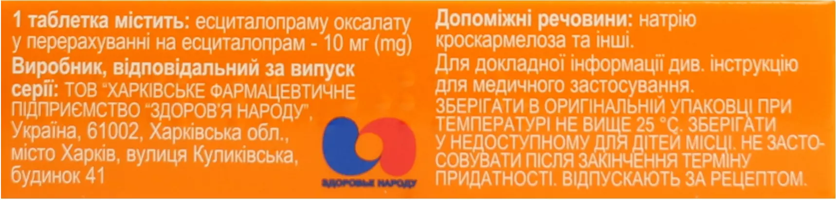 1 таблетка містить есциталопраму оксалату у перерахуванні на есциталопрам 5 мг, або 10 мг, або 20 мг;