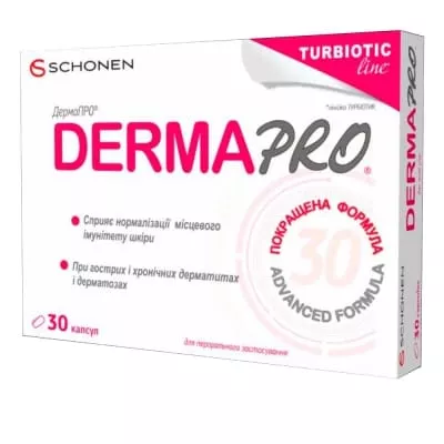 Lactobacillus rhamnosus GG, що входять до складу ДермаПРО 30, запобігають розмноженню патогенних мікроорганізмів у кишечнику та сприяють відновленню балансу корисної мікрофлори, усуненню дисбактеріозу та нормалізації травлення. Вони позитивно впливають не тільки на кишечник, а й на організм у цілому, підвищуючи імунітет. Lactobacillus rhamnosus GG мають найбільшу кількість характеристик і властивостей, рекомендованих для оптимального імунобіотика, включаючи прекрасну здатність до виживання і транзиторну колонізацію в ШКТ, що зумовлені здатністю Lactobacillus rhamnosus GG прикріплюватися до слизової оболонки та епітеліальних клітин кишечнику.