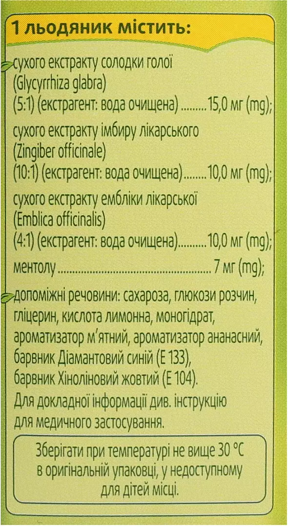 1 льодяник містить: сухого екстракту солодки голої (Glycyrrhiza glabra) (5:1) (екстрагент: вода очищена) 3,0 мг; сухого екстракту імбиру лікарського (Zingiber officinale) (10:1) (екстрагент: вода очищена) 1,0 мг; сухого екстракту ембліки лікарської (Emblica officinalis) (4:1) (екстрагент: вода очищена) 2,5 мг; ментолу 7,0 мг;
