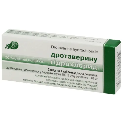 1 таблетка містить дротаверину гідрохлориду у перерахунку на 100 % суху речовину 40 мг;