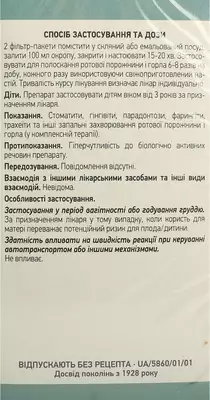2 фільтр-пакети помістити у скляний або емальований посуд, залити 100 мл окропу, закрити і настоювати 15-20 хв. Застосовувати для полоскання ротової порожнини і горла 6-8 разів на добу, кожного разу використовуючи свіжоприготовлений настій.