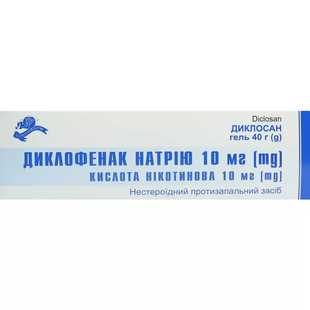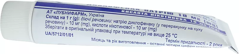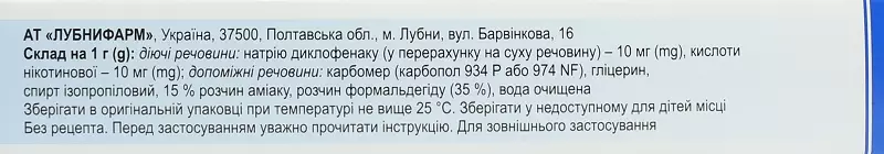 Передозування.Передозування малоймовірне у зв’язку з низькою абсорбцією диклофенаку у системний кровоток при місцевому застосуванні. У разі випадкового проковтування слід враховувати, що 1 туба препарату по 100 г містить еквівалент 1 г диклофенаку натрію; при цьому можливий розвиток системних побічних реакцій.