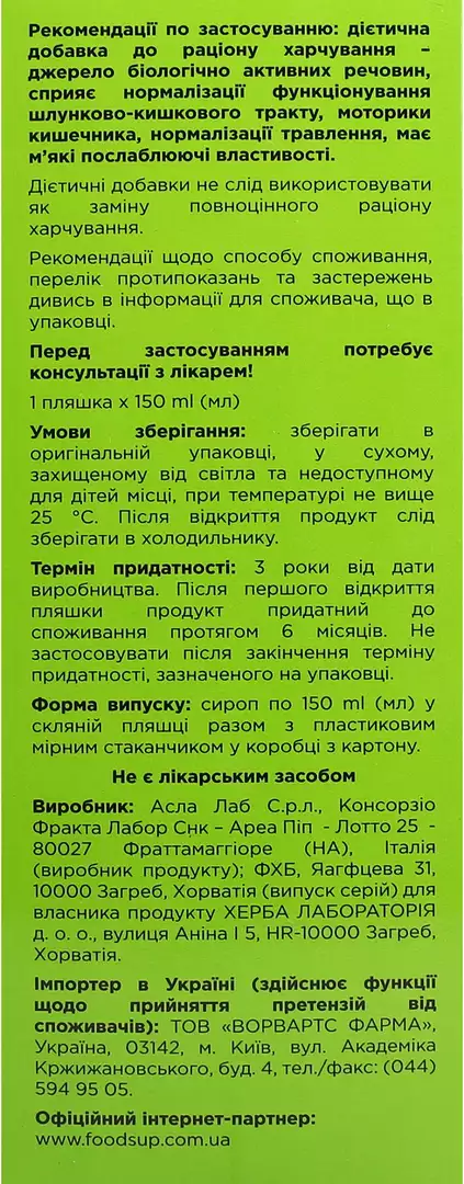 Протипоказання: індивідуальна чутливість до компонентів, що входять до складу продукту, діти до 3 років. Застереження: вагітним жінкам та жінкам у період лактації застосовувати тільки за призначенням лікаря. Надмірне споживання може спричинити послаблювальний ефект. Умови зберігання: зберігати в оригінальній упаковці, у сухому, захищеному від світла та недоступному для дітей місці, при температурі не вище 25°С. Після відкриття продукт слід зберігати в холодильнику. Термін придатності: 3 роки від дати виробництва. Після першого відкриття пляшки продукт придатний до споживання протягом 6 місяців. Не застосовувати після закінчення терміну придатності, зазначеного на упаковці. Форма випуску: сироп по 150 ml (мл) у скляній пляшці разом з пластиковим мірним стаканчиком у коробці з картону. Виробник: Асла Лаб С.р.л., Консорзіо Фракта Лабор Снк - Ареа Піп - Лотто 25 - 80027 Фраттамаггіоре (НА), Італія/ Asia Lab S.r.l., Consorzio Fracta Labor Snc - Area Pip - Lotto 25 - 80027 Frattamaggiore (NA) - Italy (виробник продукту); ФХБ, Яагфцева 31, 10000 Загреб, Хорватія/ PBF, Jagiceva 31, 10000 Zagreb, Croatia (випуск серій) для власника продукту ХЕРБА ЛАБОРАТОРІЯ д. о. о., вулиця Аніна I 5, HR-10000 Загреб, Хорватія/HERBA LABORATORIJ d.o.o., Anina I br. 5, HR-10000 Zagreb, Croatia.Імпортер в Україні (здійснює функції щодо прийняття претензій від споживачів): ТОВ «ВОРВАРТС ФАРМА», Україна, 03142, м. Київ, вул. Академіка Кржижановського, буд. 4, тел./факс: (044) 594 95 05.