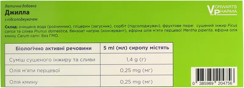 Склад: очищена вода (розчинник), гліцерин (загусник), сорбіт (підсолоджувач), фруктове пюре: сушений інжир Ficus carica та слива Prunus domestica, бензоат натрію (консервант), ефірна олія м'яти перцевої Mentha piperita, ефірна олія кмину Carum carvi. Без ГМО.Біологічно активні речовини |