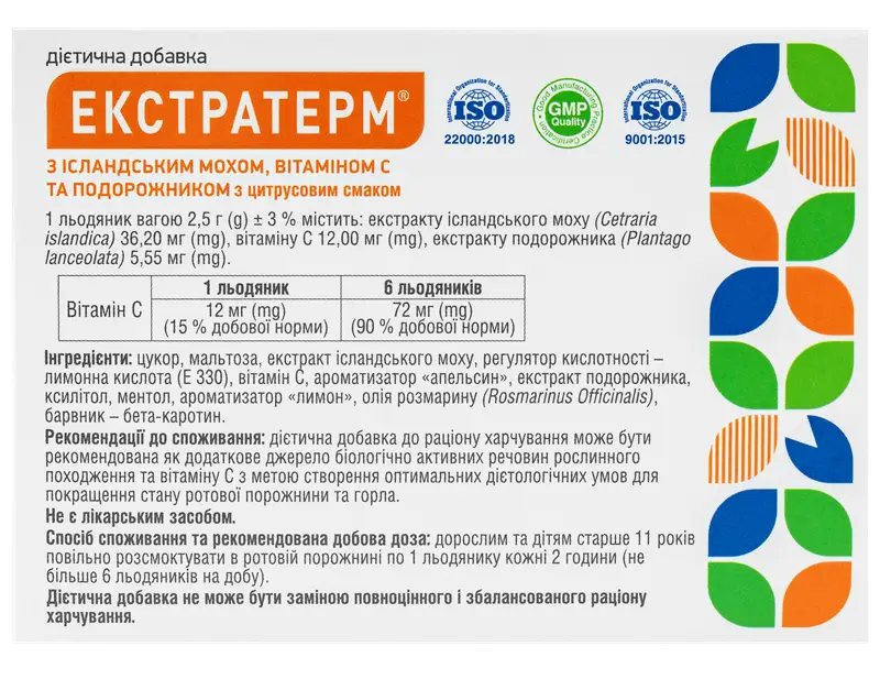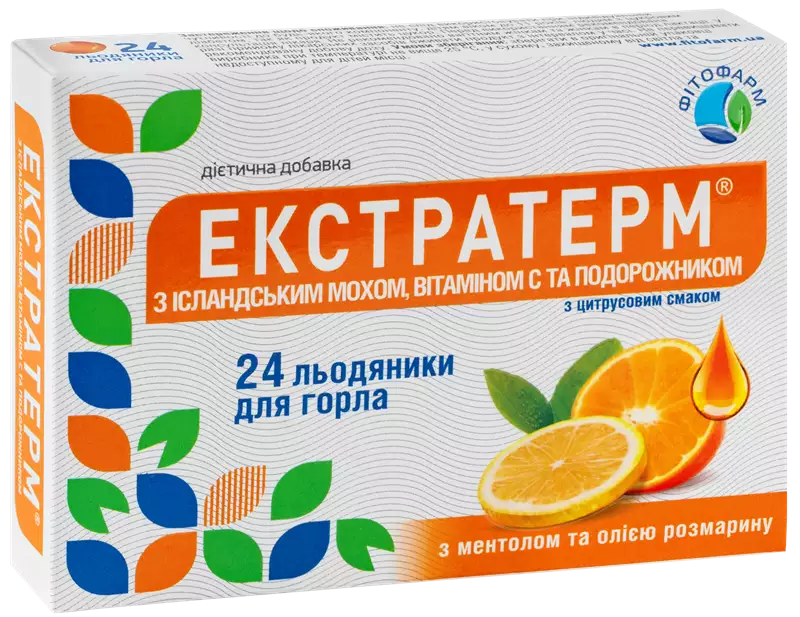 Інструкція для Екстратерм з ісландським мохом, вітаміном С та подорожником льодяники з цитрусовим смаком №24 Роздрукувати