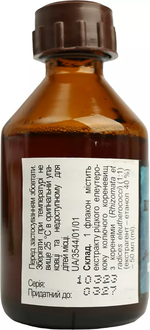 Склад:діюча речовина: 1 флакон містить екстракту рідкого елеутерококу колючого кореневищ з коренями (Rhizomata et radices eleutherococci) (1:1) (екстрагент – етанол 40 %) – 50 мл;