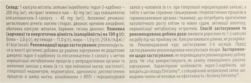 Показання до застосування Рекомендується в якості дієтичної добавки до раціону харчування як додаткове джерело індол-3-карбінолу і епігаллокатехін-3-галлата з метою нормалізації метаболічних процесів в репродуктивних органах і молочних залозах у жінок (в тому числі при лейоміомі матки, мастопатії, гіперплазії ендометрію, ендометріозі, аденоміозі; диспластичних процесах в шийці матки, асоційованих з ВПЛ) і передміхуровій залозі у чоловіків (в т.ч. при гіперплазії передміхурової залози), з метою сприяння гальмуванню гіперпластичних процесів в гормонозалежних органах і тканинах, що вимагають придушення патологічного росту клітин і нових судин, активації апоптозу, нормалізації метаболізму естрогенів. Спосіб застосуванняВживати дорослим по 1–2 капсули на день під час їжі. Капсули приймати цілими, не розкриваючи. Тривалість застосування і необхідність повторного курсу визначає лікар індивідуально.