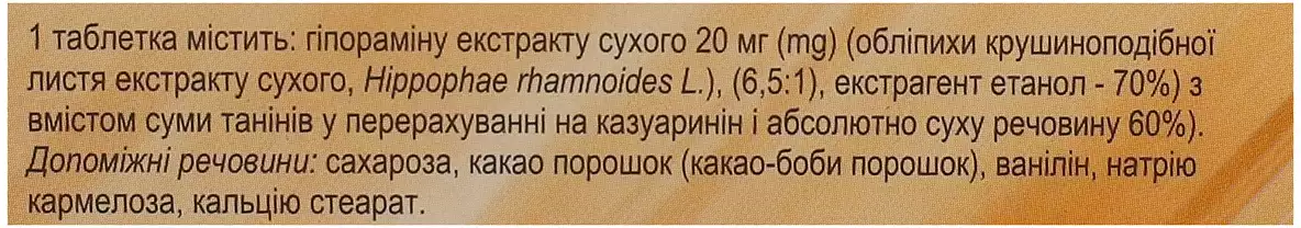 діюча речовина: гіпораміну екстракту сухого (обліпихи крушиноподібної листя екстракту сухого, Hippophae rhamnoides L.), (6,5:1), екстрагент етанол – 70 %) з вмістом суми танінів у перерахуванні на казуаринін і абсолютно суху речовину 60 %);