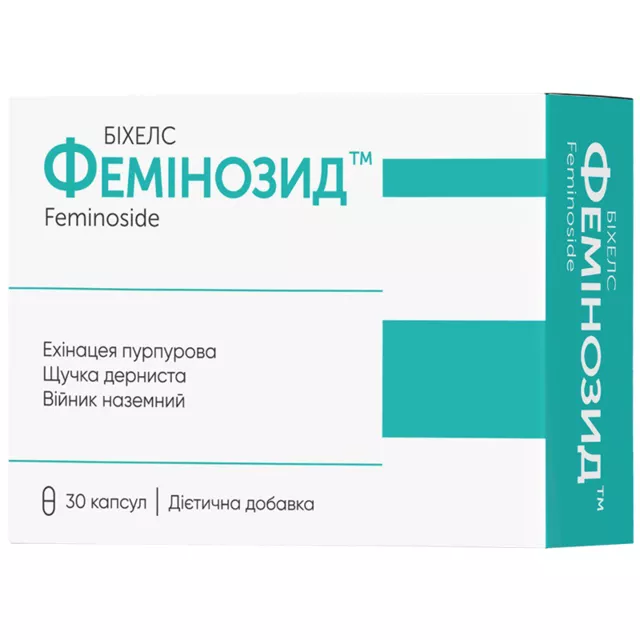 Загальні властивості: олійний розчин екстракту суміші трав (див. Склад) є джерелом флавоноїдів у вигляді ліпідних комплексів – біологічно-активних речовин, здатних сприятливо впливати на стан імунної системи, підтримувати природні захисні функції організму, сприяти нейтралізації вільних радикалів, запобігаючи пошкодженню клітин організму; олійний екстракт ехінацеї містить цінні поліненасичені жирні кислоти, полісахариди, глікозиди, алкалоїди та мікроелементи, які покращують самопочуття при підвищених фізичних навантаженнях та психічний перевтомі. Спосіб споживання: дорослим та дітям від 12 років приймати по 1 капсулі 1 раз на добу, бажано на ніч, запиваючи ½ склянки питної води. Рекомендований термін споживання становить від 2 до 4 тижнів. В період поширення сезонних захворювань може бути продовжений до 6 тижнів. Застереження при споживанні: не вживати при алергії та індивідуальній непереносимості до інгредієнтів, що входять до складу дієтичної добавки. При хронічному гастродуоденіті, у разі його загострення, капсули необхідно приймати через 1,5-2 години після приймання їжі. Не перевищувати добову рекомендовану кількість споживання. Не вживати після кінцевої дати споживання, вказаної на упаковці. Капсули Фемінозид® не слід використовувати як заміну повноцінного раціону харчування. Перед споживанням проконсультуйтесь з лікарем. Вагітним та жінкам, в період годування грудьми, перед споживанням капсул обов’язкова консультація лікаря.