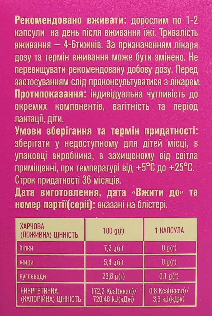 Спосіб застосування. Дорослим по 1-2 капсули на день після їди. Тривалість застосування – 4-6 тижнів. За призначенням лікаря дозу та термін застосування може бути змінено.