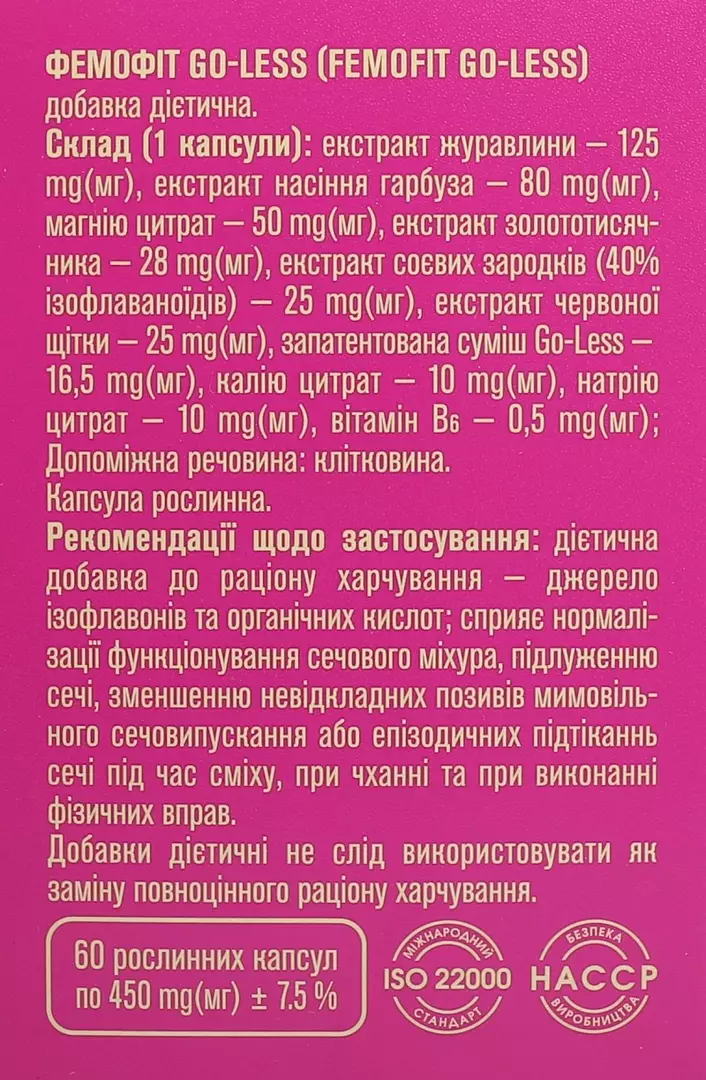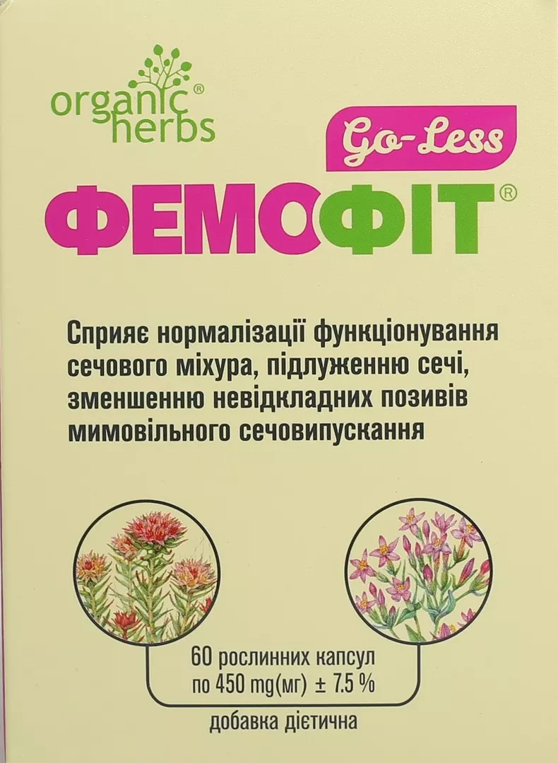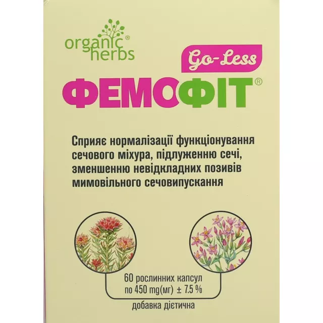 Фемофіт Go-Less це натуральна дієтична добавка до раціону харчування, що містить тільки інгредієнти рослинного походження, мінерали та вітаміни. Її збалансований склад сприяє нормалізації функціонування сечового міхура. Фемофіт Go-Less сприяє покращенню функціонування організму при таких станах як олужнення сечі та мимовільне сечовипускання. Він зменшує частоту невідкладних позивів у туалет і оптимізує рівень життя пацієнтів, які страждають на хвороби сечового міхура. Добавка однаково добре справляється з фізіологічними проблемами, які викликані старінням, так і з нетриманням сечі після оперативного втручання або серйозного захворювання. Натуральні екстракти, біологічні добавки та ізофлавони допоможуть швидко вирішити проблему із сечовипусканням.