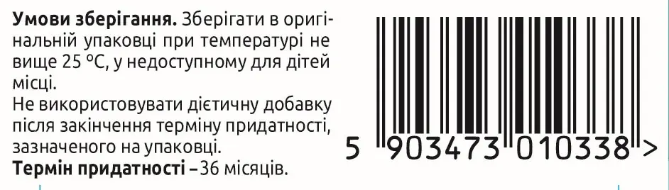 та термін придатності: зберігати в оригінальній упаковці при температурі не вище 25 ºС, у недоступному для дітей місці. Не використовувати дієтичну добавку після закінчення терміну придатності, зазначеного на упаковці.