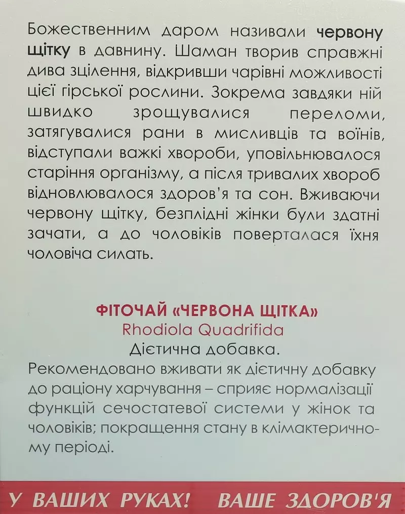 Склад:дрібно подрібнені корені родіоли чотирьохчастної (червоної щітки) (Rhodiola quadrifida) 100 %
