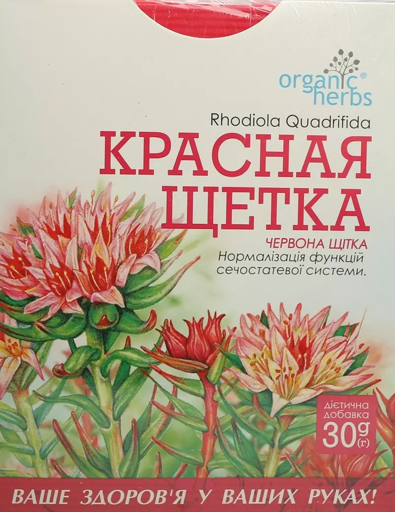 Червона щітка (родіола чотирьохчастинна) багаторічна, низькоросла рослина. Рослина володіє рядом властивостей, які роблять її прекрасним засобом для боротьби з чоловічими і жіночими захворюваннями статевої системи. Це чудовий цілющий засіб, як для спринцювань, так і для вживання всередину. Фіточай чудово підійде як жінкам, так і чоловікам.