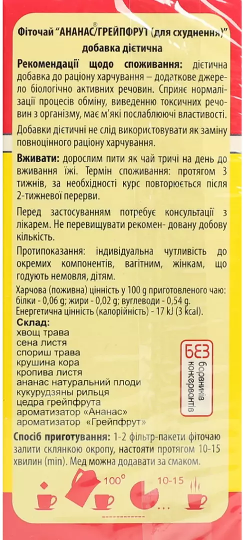 Склад: хвощ трава, сена листя, спориш трава, крушина кора, кропива листя, ананас натуральний плоди, кукурудзяні рильця, цедра грейпфрута, ароматизатор «Ананас», «Грейпфрут». Рекомендації щодо споживання: дієтична добавка до раціону харчування – додаткове джерело біологічно активних речовин. Сприяє нормалізації процесів обміну, виведенню токсичних речовин з організму, має м’які послаблюючі властивості. Добавки дієтичні не слід використовувати як заміну повноцінного раціону харчування. Спосіб застосування: дорослим пити як чай тричі на день до вживання їжі. Термін споживання: протягом 3 тижнів, за необхідності курс повторюється після 2-тижневої перерви.Перед застосуванням потребує консультації з лікарем. Не перевищувати рекомендовану добову кількість.