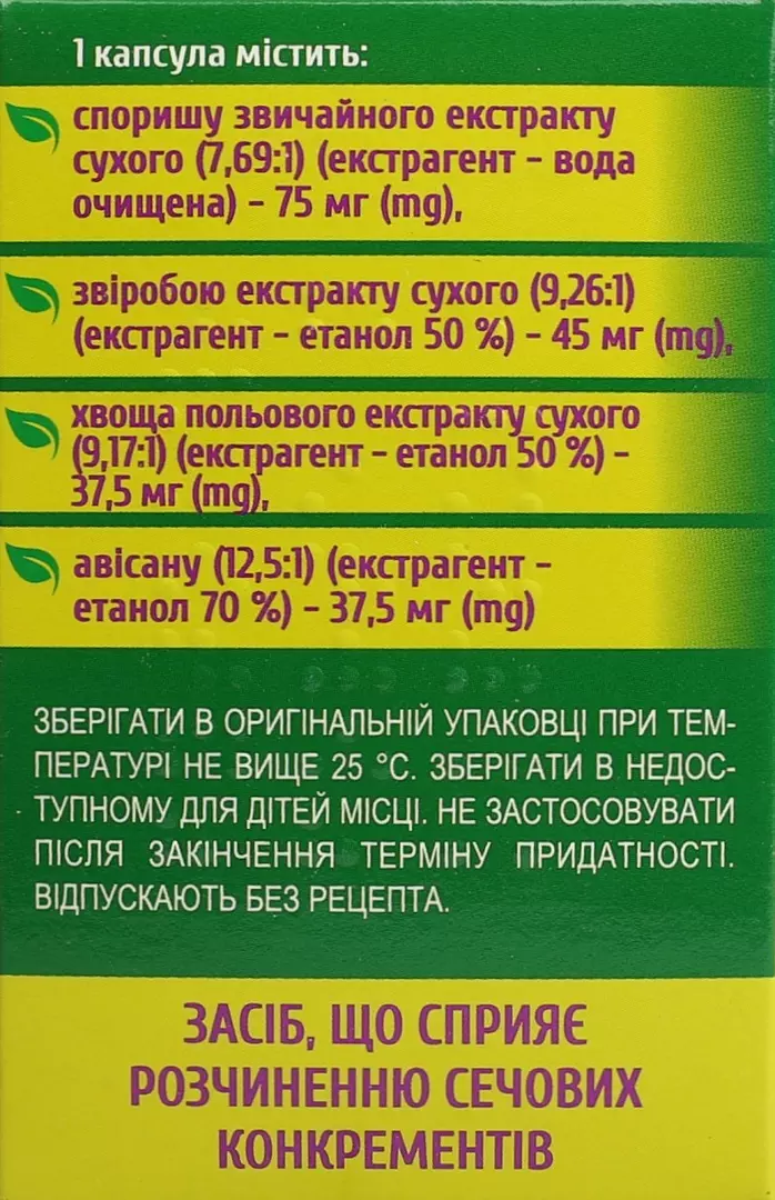 Склад:діючі речовини: 1 капсула містить споришу звичайного екстракту сухого (7,69:1) (екстрагент – вода очищена) 75 мг, звіробою екстракту сухого (9,26:1) (екстрагент – етанол 50 %) 45 мг, хвоща польового екстракту сухого (9,17:1) (екстрагент – етанол 50 %) 37,5 мг, авісану (12,5:1) (екстрагент – етанол 70 %) 37,5 мг;