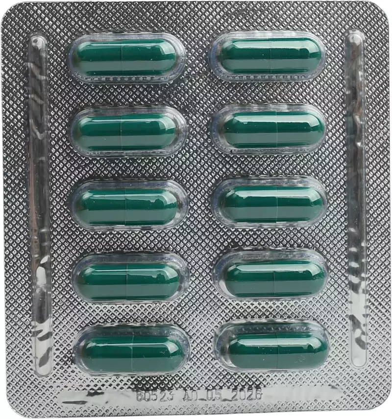 Лікарська форма. Капсули.Основні фізико-хімічні властивості: тверді желатинові капсули зеленого кольору. Вміст капсули ‒ суміш гранул і порошку від світло-коричневого до темно-коричневого з зеленуватим відтінком кольору. Допускається наявність агломератів часток порошку. На капсулу допускається наносити товарний знак підприємства ‒ ЗТ.