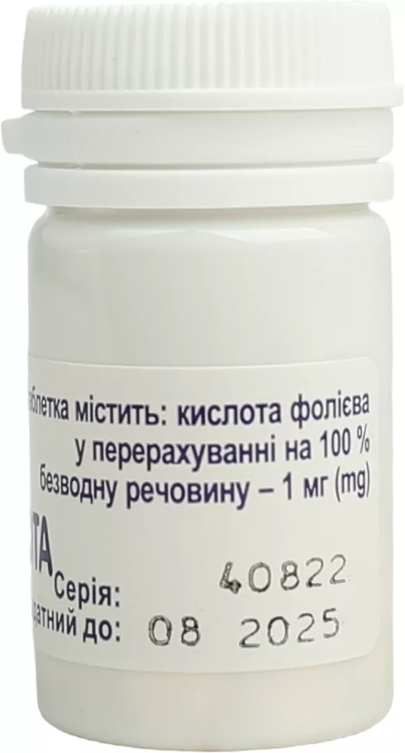 1 таблетка містить кислоти фолієвої у перерахунку на 100 % безводну речовину 1 мг або