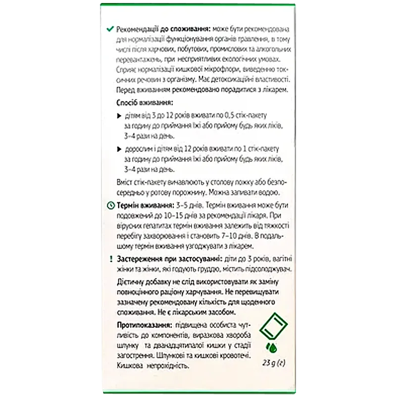 Дітям від 3 до 12 років вживати по 0,5 стік-пакету за годину до приймання їжі або прийому будь яких ліків, 3–4 рази на день. Дорослим і дітям від 12 років вживати по 1 стік-пакету за годину до приймання їжі або прийому будь яких ліків, 3–4 рази на день. Вміст стік-пакету вичавлюють у столову ложку або безпосередньо у ротову порожнину. Можна запивати водою.