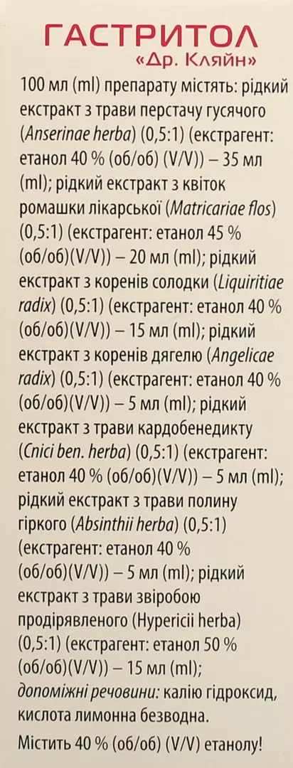 рідкий екстракт трави перстачу гусячого (Anserinae herba) (1 : 1,7–2,2) [екстрагент: етанол 40 % (об/об)] — 35 мл; рідкий екстракт квіток ромашки лікарської (Matricariae flos) (1 : 1,7–2,2) [екстрагент: етанол 45 % (об/об)] — 20 мл; рідкий екстракт коренів солодки (Liquiritiae radix) (1 : 1,7–2,2) [екстрагент: етанол 40 % (об/об)] — 15 мл; рідкий екстракт коренів дягелю (Angelicae radix) (1 : 1,7–2,2) [екстрагент: етанол 40 % (об/об)] — 5 мл; рідкий екстракт трави кардобенедикту (Cnici ben. herba) (1 : 1,7–2,2) [екстрагент: етанол 40 % (об/об)] — 5 мл; рідкий екстракт трави полину гіркого (Absinthii herba) (1 : 1,7–2,2) [екстрагент: етанол 40 % (об/об)] — 5 мл;