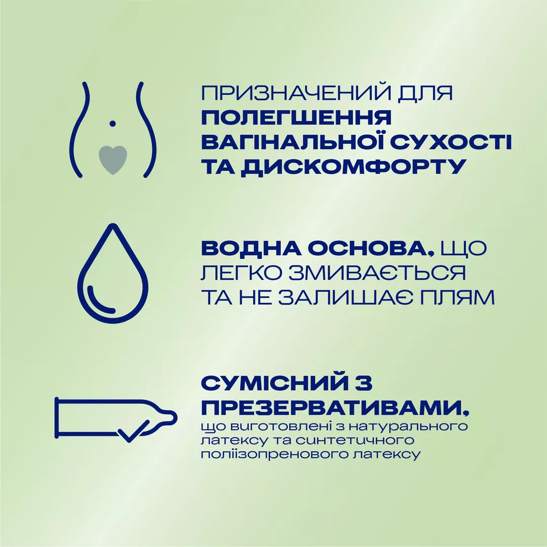 Застереження Використовуйте тільки за призначенням. Не є контрацептивом, не містить сперміциди, може сповільнювати рух сперматозоїдів. Уникайте контакту з очима, пошкодженою шкірою та ранами. При подразненні припиніть використання. Зверніться до лікаря, якщо подразнення зберігається, або якщо ви відчуваєте постійну вагінальну сухість. Проконсультуйтеся з лікарем щодо використання в період вагітності та годування груддю. Зберігати в недоступному для дітей місці. Не використовувати з презервативами, що виготовлені із поліуретану. У випадку небажаних явищ після проковтування продукту, необхідно звернутися за медичною допомогою та надати упаковку або етикетку продукту.