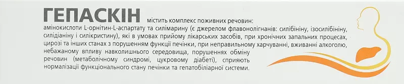 Гепаскін містить комплекс поживних речовин: амінокислоти L–орнітин–L–аспартату та силімарину (є джерелом флавонолігнанів: силібініну, ізосилібініну, силідіаніну і силікристину), які в умовах прийому лікарських засобів, при хронічних запальних процесах, цирозі та інших станах з порушенням функції печінки, при неправильному харчуванні, вживанні алкоголю, небажаному впливу навколишнього середовища, порушеннях обміну речовин (метаболічному синдромі, цукровому діабеті), сприяють нормалізації функціонального стану печінки та гепатобіліарної системи.