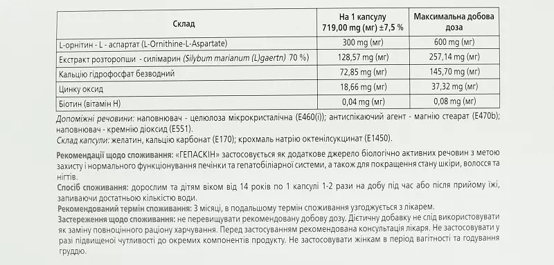 Рекомендації з вживанняГепаскін вживати як додаткове джерело біологічно активних речовин з метою захисту і нормального функціонування печінки та гепатобіліарної системи, а також для покращення стану шкіри, волосся та нігтів.