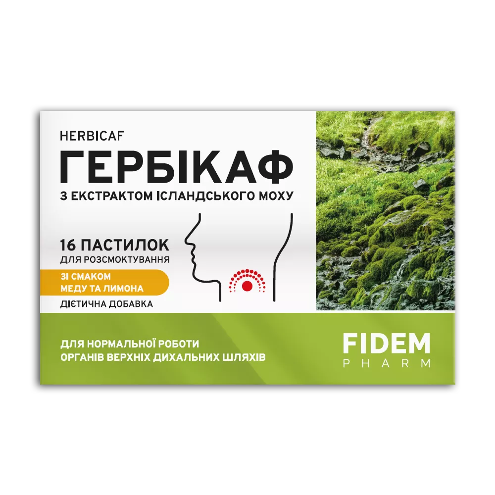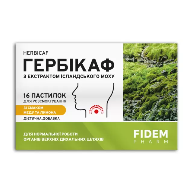 Гербікаф пастилки з екстрактом ісландського моху зі смаком меду та лимона №16, Фідем Фарм, Меркурій ТОВ